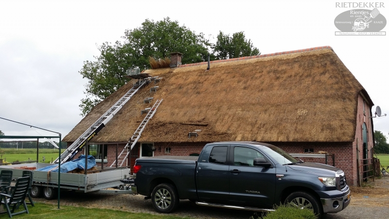Nieuw riet langs de nok en bestaande nokvorsten opnieuw aanbrengen, dak schoonmaken en repareren, behandelen met algenremmer.