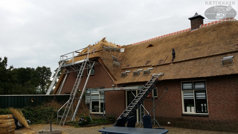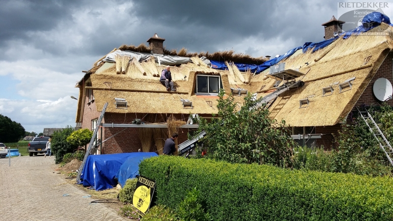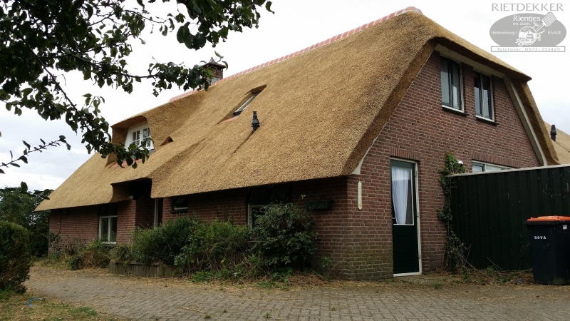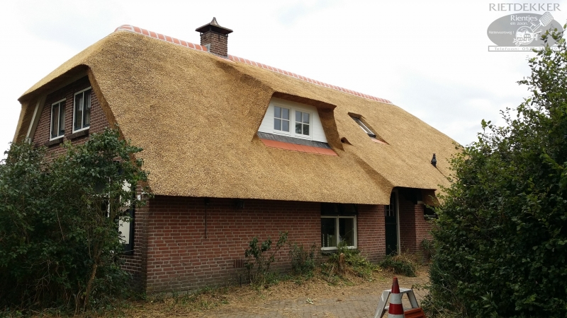 Woning door ons voorzien van schroefdak beplating, en gedekt met gelabeld wieden riet.